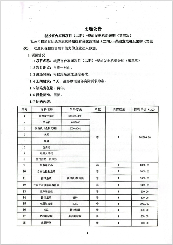城投富台家园项目二期-柴油发电机组采购(第三次)比选公告