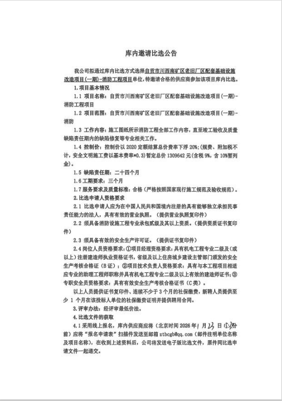 自贡市川西南矿区老旧厂区配套基础设施改造项目(一期)-消防工程项目库内邀请比选公告