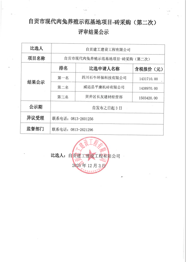 自贡市现代肉兔养殖示范基地项目-砖采购(第二次)评审结果公示