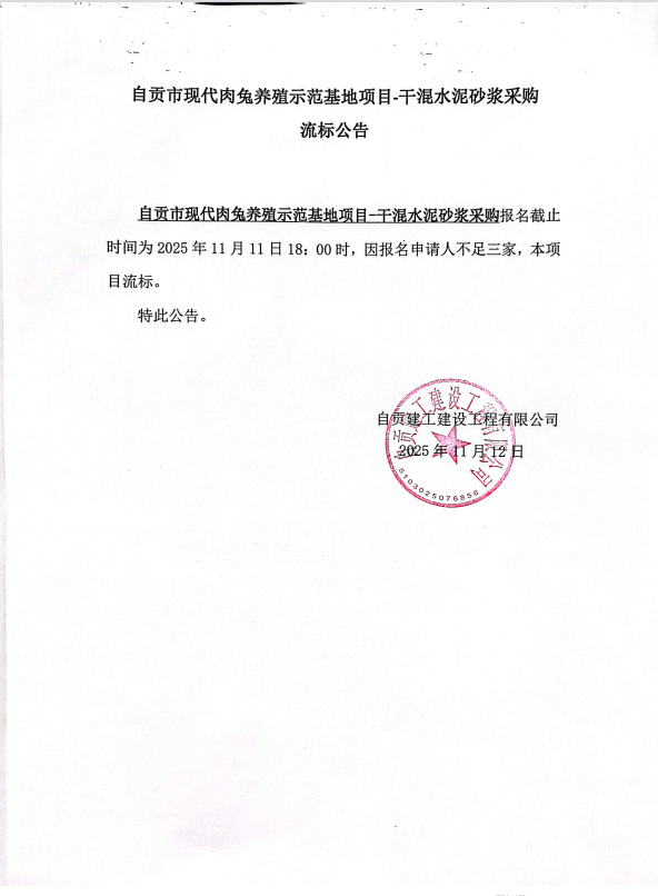 自贡市现代肉兔养殖示范基地项目-干混水泥砂浆采购流标公告