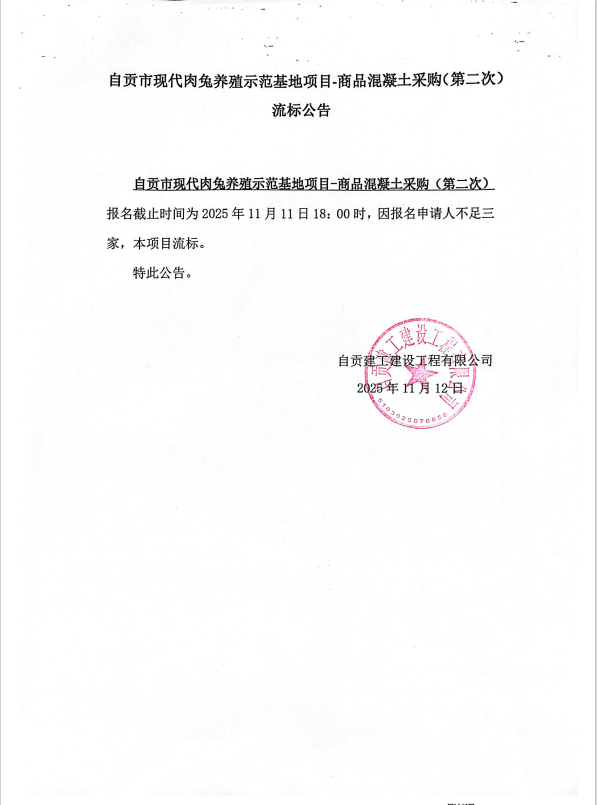 自贡市现代肉兔养殖示范基地项目-商品混凝土采购(第二次)流标公告
