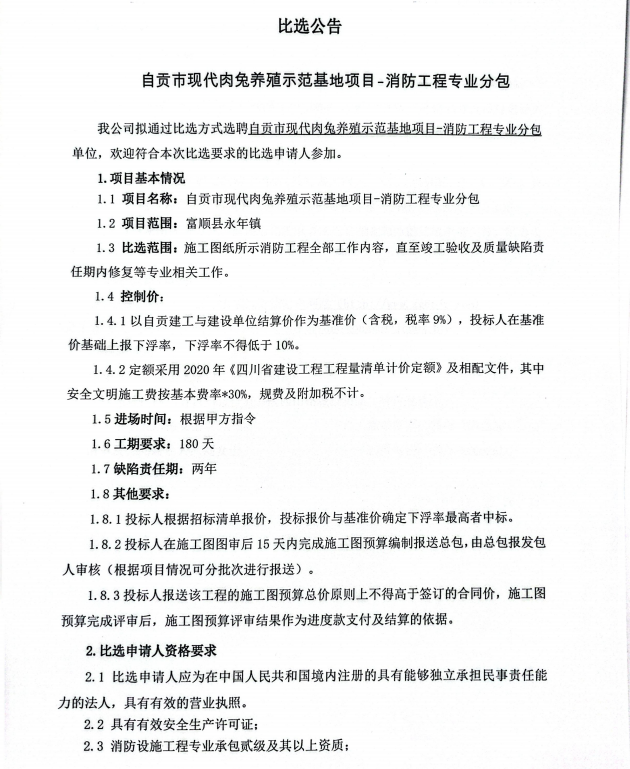 自贡市现代肉兔养殖示范基地项目-消防工程专业分包比选公告
