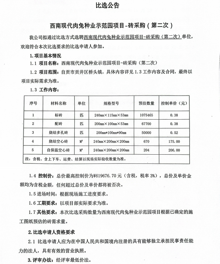 西南现代肉兔种业示范园项目-砖采购(第二次)比选公告