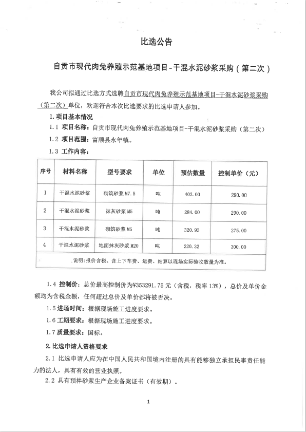 自贡市现代肉兔养殖示范基地项目-干混水泥砂浆采购(第二次)比选公告